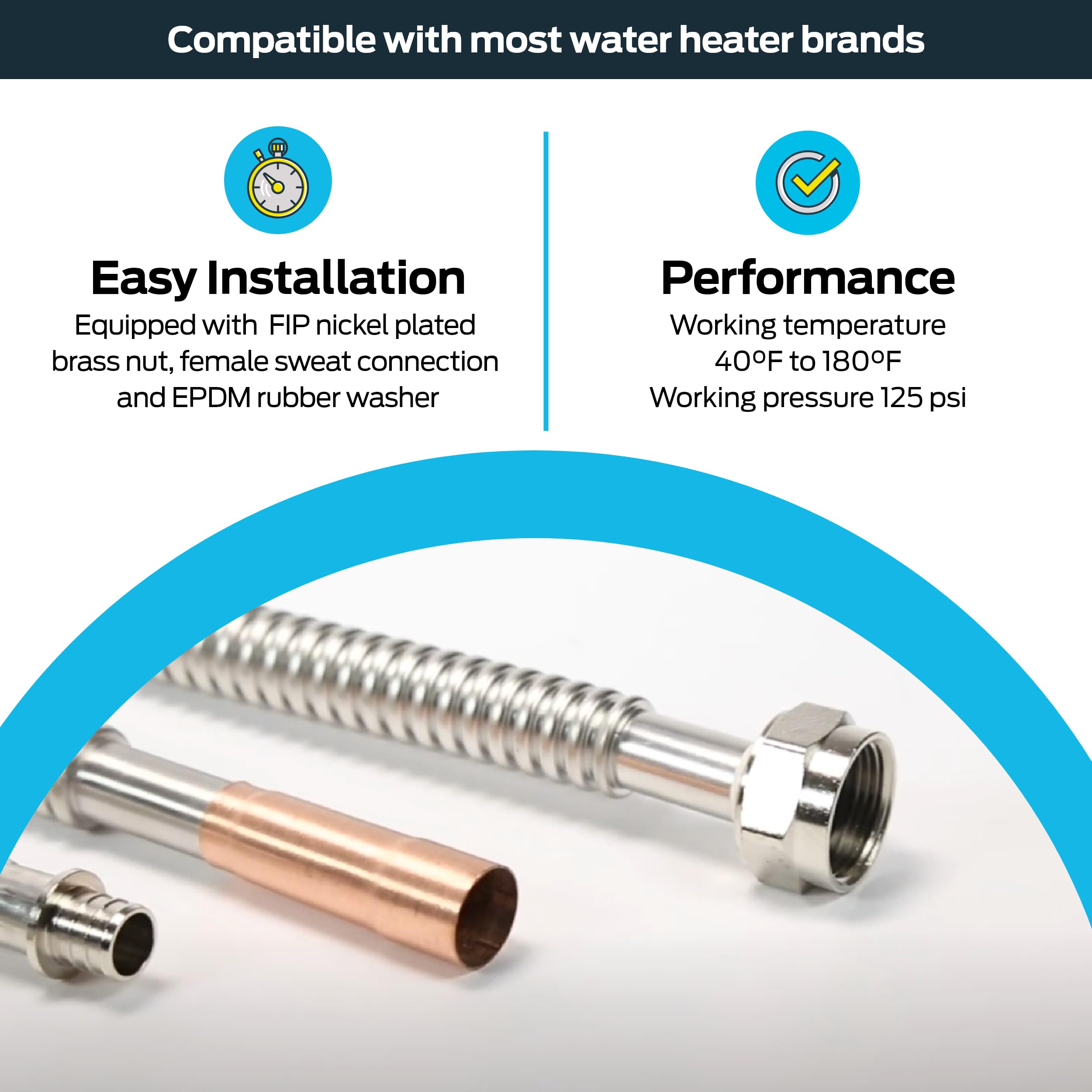 - UNIVERSAL WATER HEATER CONNECTOR: The Eastman WaterFlex sweat connector is designed for various water heating applications; This 24 in. flexible water heater supply line is equipped with 3/4 in. FIP and 3/4 in. female sweat connections