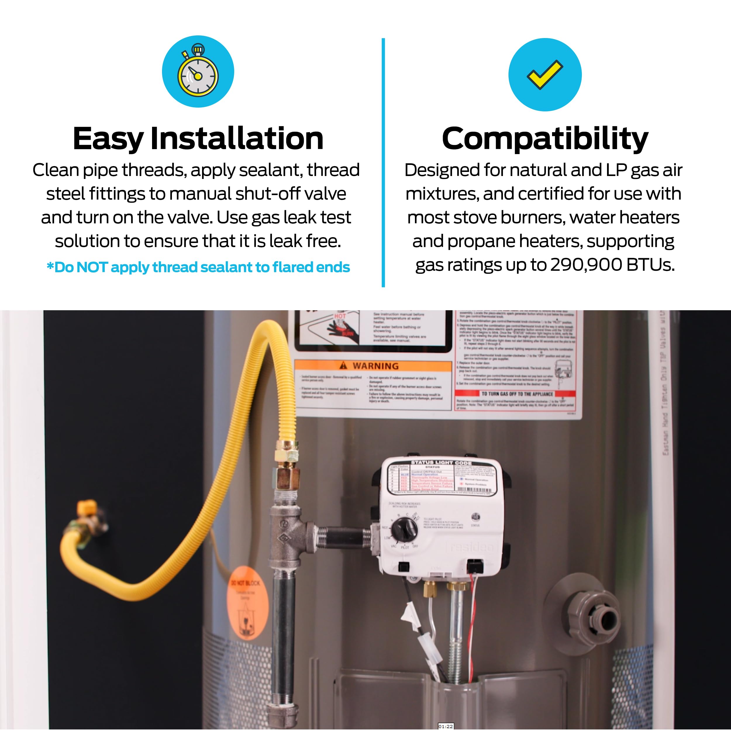 - SPECS: This 24 inch long 1 in OD gas line connector kit is certified for use with most stove burners, water heaters and propane heaters, supporting gas ratings up to 290,900 BTUs